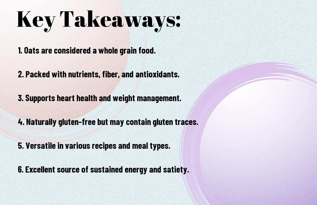 Now that you have explored the nature of oats, you can confidently conclude that they are indeed a whole food. Rich in nutrients and health benefits, incorporating oats into your diet can enhance your overall well-being. As you focus on whole food options, remember that oats, in their minimally processed form, provide imperative fiber, vitamins, and minerals that support a balanced lifestyle. Embrace oats as a wholesome addition to your meals and reap the rewards of this nutritious grain.