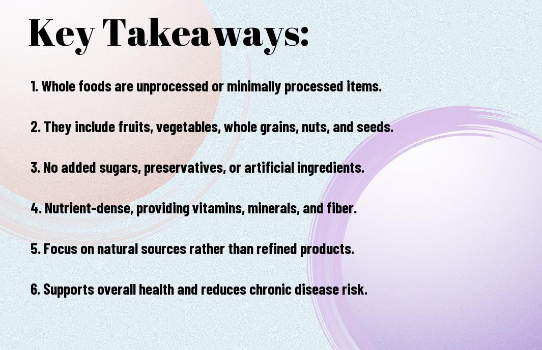 Many people are curious about what defines a whole food and why it matters for your health. Whole foods are those that are minimally processed and free from artificial additives, providing you with crucial nutrients in their most natural state. By focusing on whole foods in your diet, you can enhance your overall well-being, support better digestion, and maintain a healthy weight. In this blog post, you will learn the key characteristics of whole foods and how they can positively impact your lifestyle.